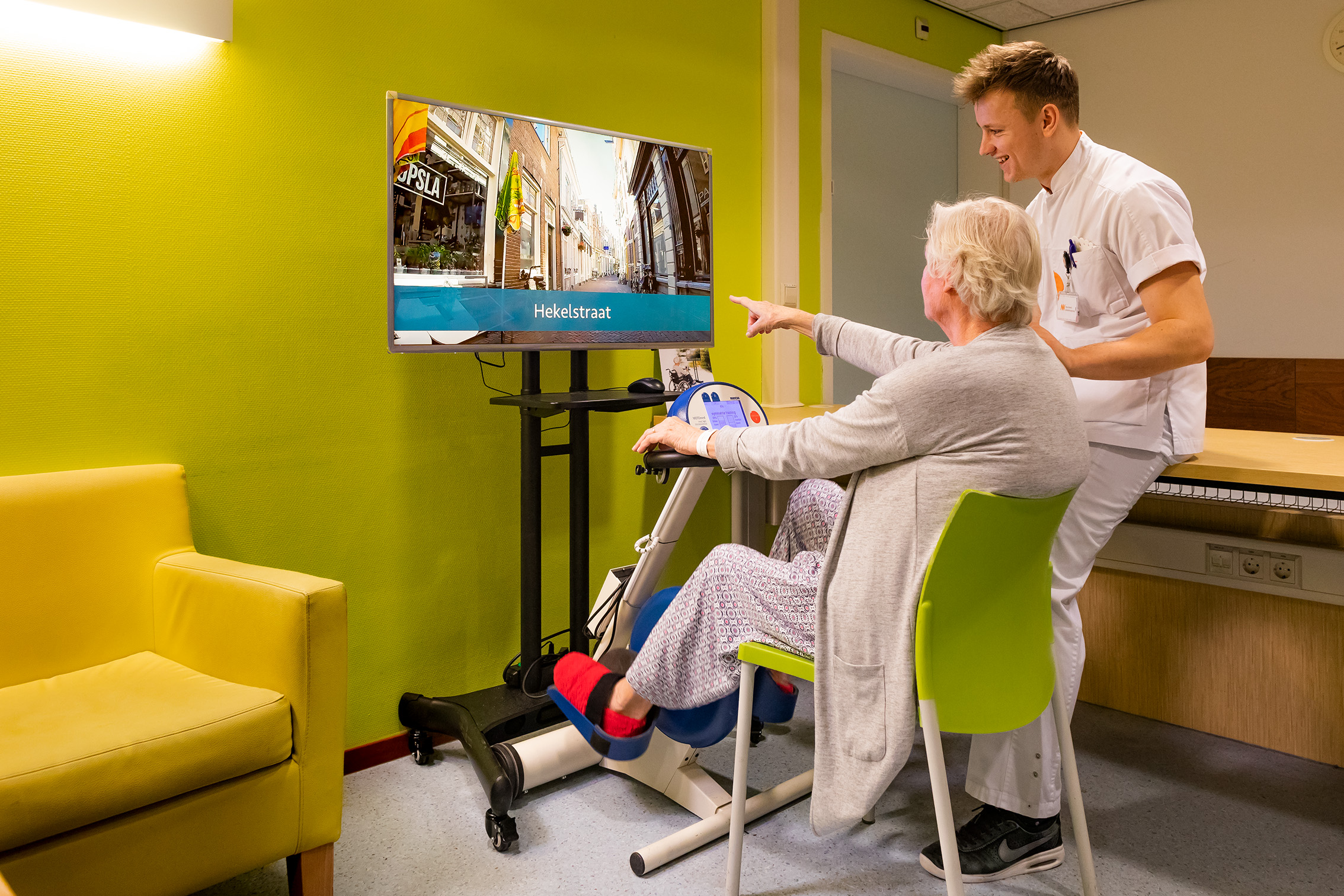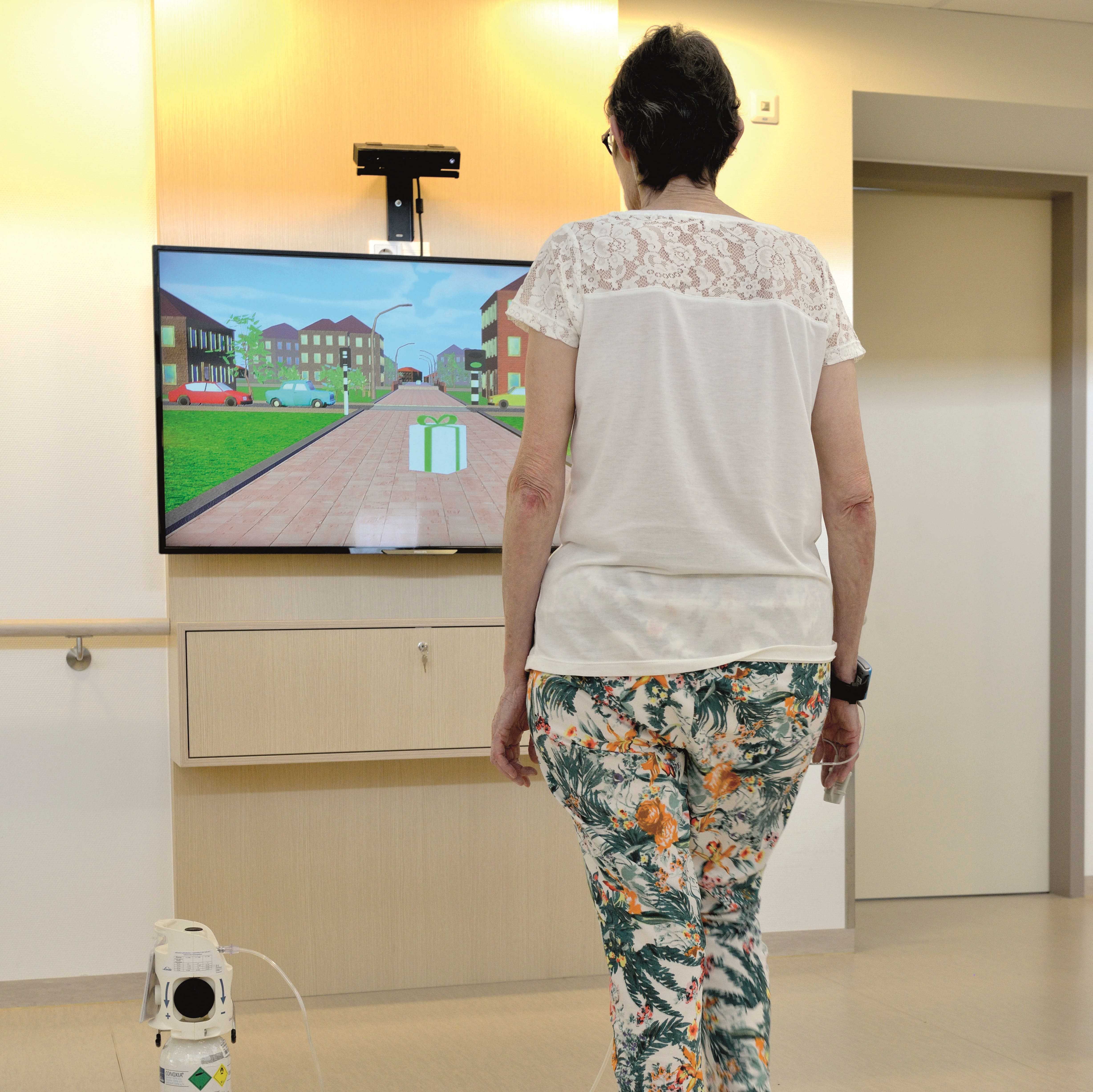‘Patiënten komen hierdoor met verhalen over hun vakanties, geschiedenis en avonturen. Een mooie afleiding voor ze, binnen het ziekenhuis en bij het ziek zijn. En ongemerkt zijn ze snel zo’n 10 minuten in beweging. Ook de Mobilyzer, een loophulp en infuuspaal-in-1, biedt mobiliteit. Als dit (nog) niet gaat, is daar de bedfiets waarmee patiënten kunnen fietsen terwijl ze in bed liggen of een arm- en beentrainer voor in bed. Belangrijk, want met bewegen tijdens de ziekenhuisopname blijft de conditie op niveau, houdt de patiënt sterkere spieren, is hij langer onafhankelijk van de zorg van anderen en voelt zich beter. Een goede conditie kan ook de kans op een complicatie verkleinen.’