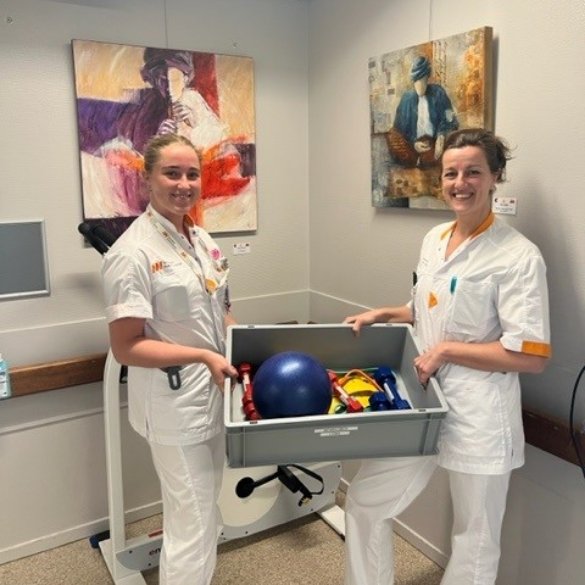 Maar liefst 12 verpleegafdelingen hebben een beweegbox ontvangen. De boxen zijn gevuld met allerlei materialen zoals ballen, dumbells, elastieken, enkelgewichtjes, steps en bedblokken. Met deze materialen willen we patiënten in beweging brengen.