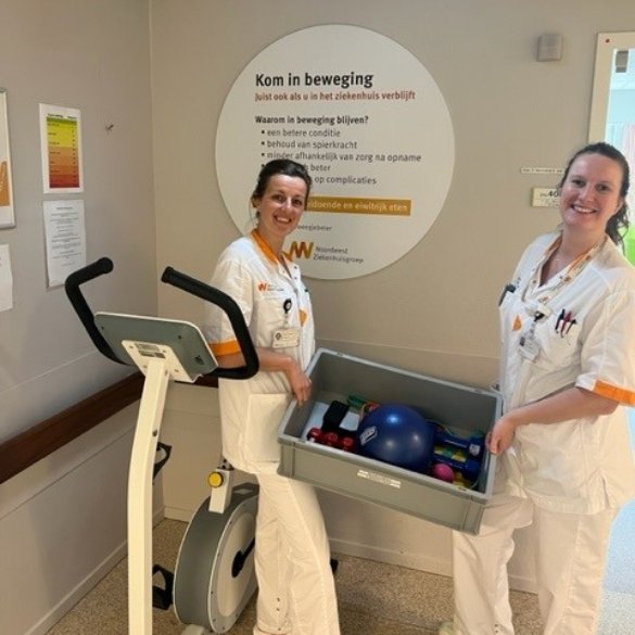 Maar liefst 12 verpleegafdelingen hebben een beweegbox ontvangen. De boxen zijn gevuld met allerlei materialen zoals ballen, dumbells, elastieken, enkelgewichtjes, steps en bedblokken. Met deze materialen willen we patiënten in beweging brengen.